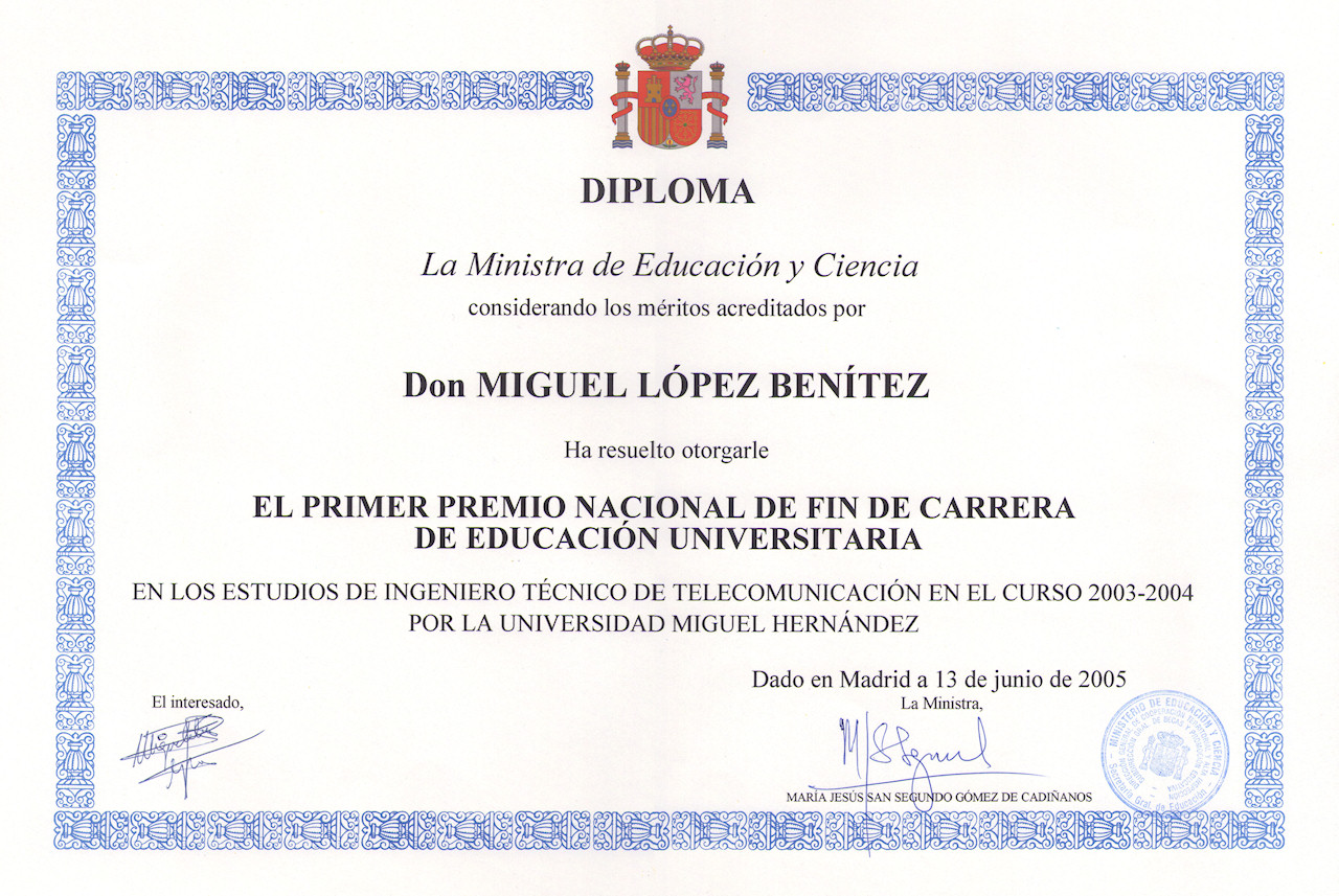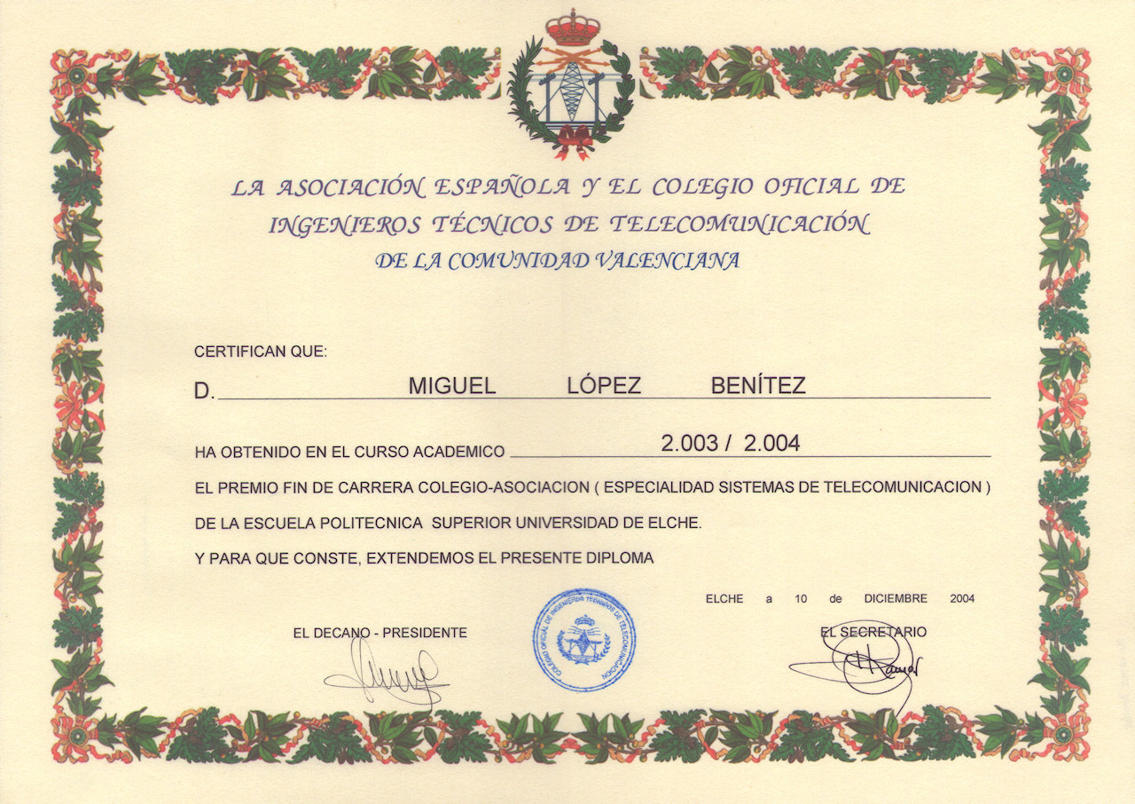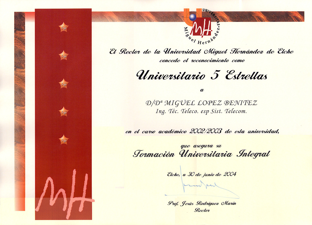 Ranked 1st out of all the students who received a B.Sc. in Telecommunications Engineering from Miguel Hernández University (UMH) in 2003.