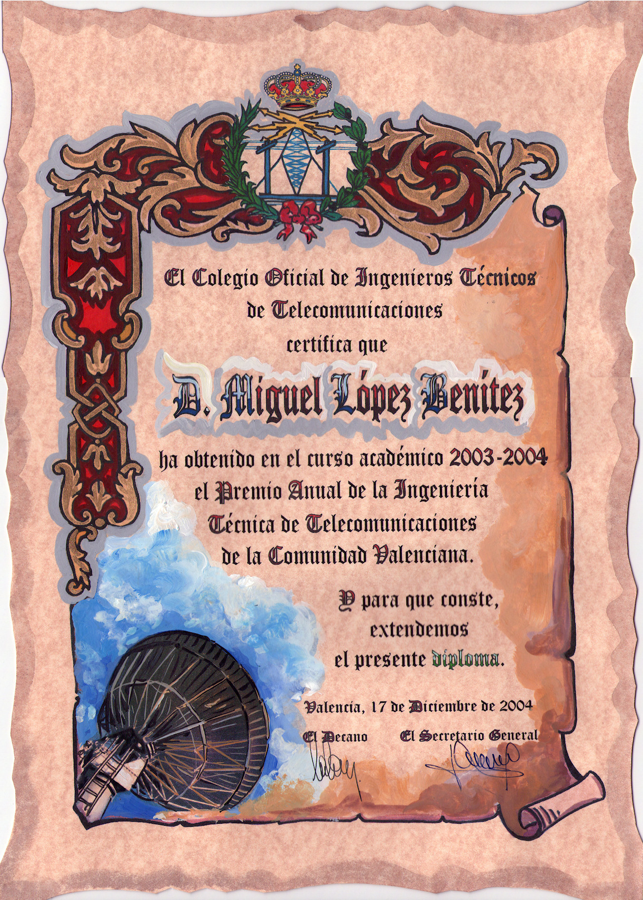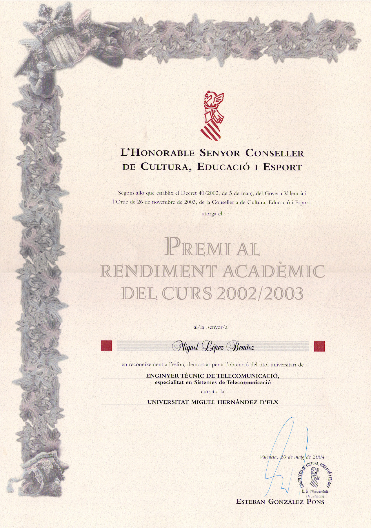 2003 Comunidad Valenciana Annual Award of B.Sc. in Telecommunications Engineering.