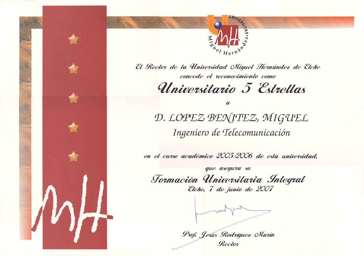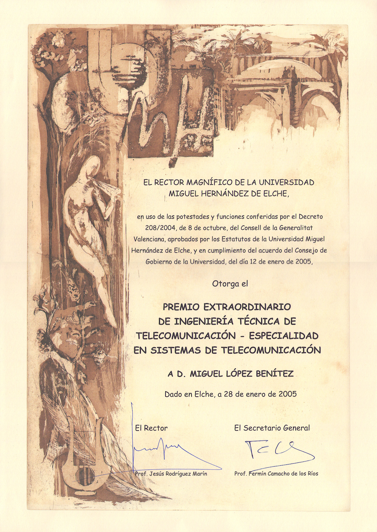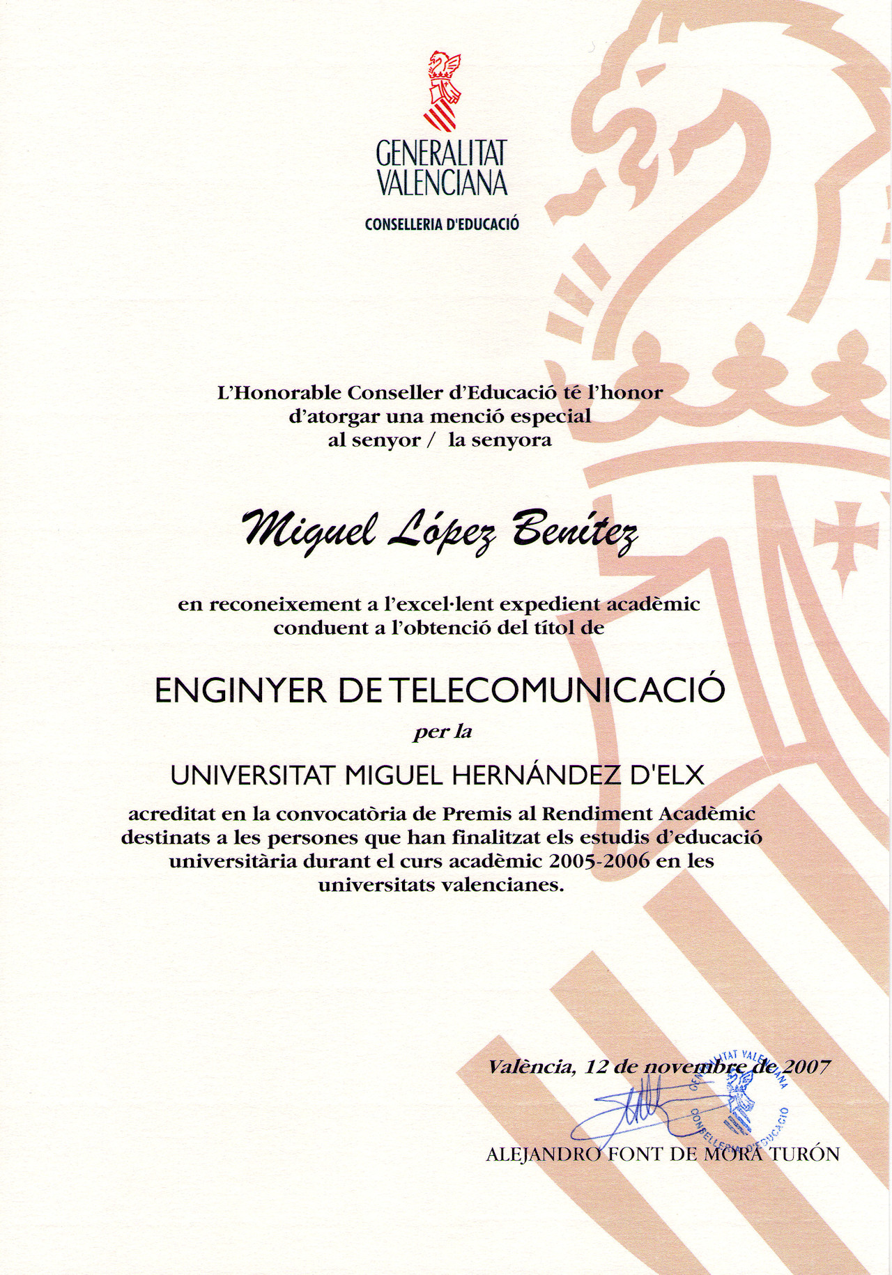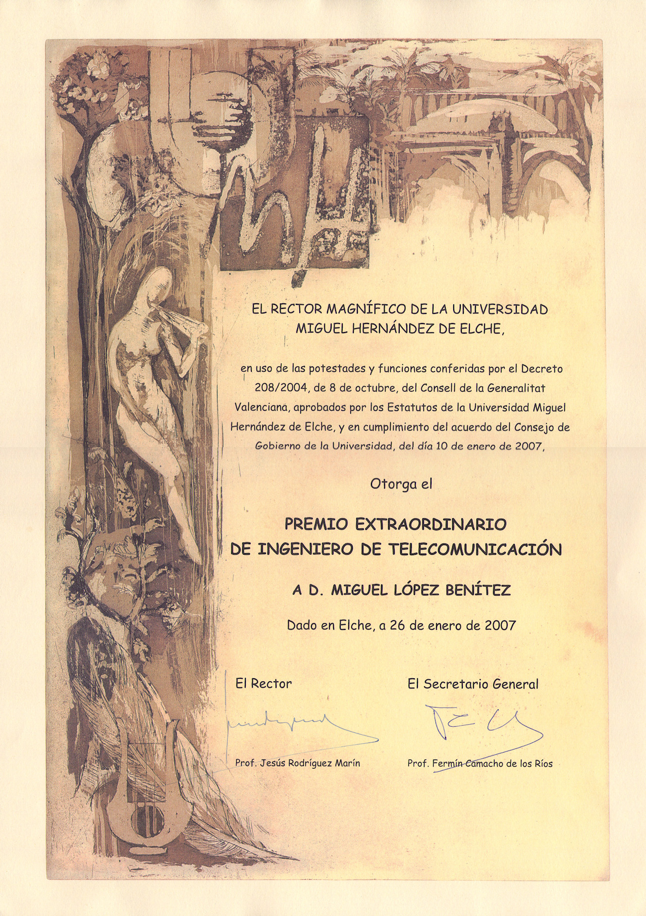 Ranked 1st out of all the students who received a M.Sc. in Telecommunications Engineering from Miguel Hernández University (UMH) in 2006.