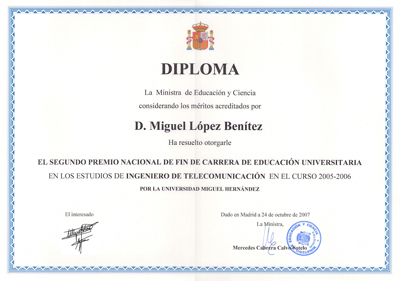 Ranked 2nd out of all the students who received a M.Sc. in Telecommunications Engineering in Spain in 2006.