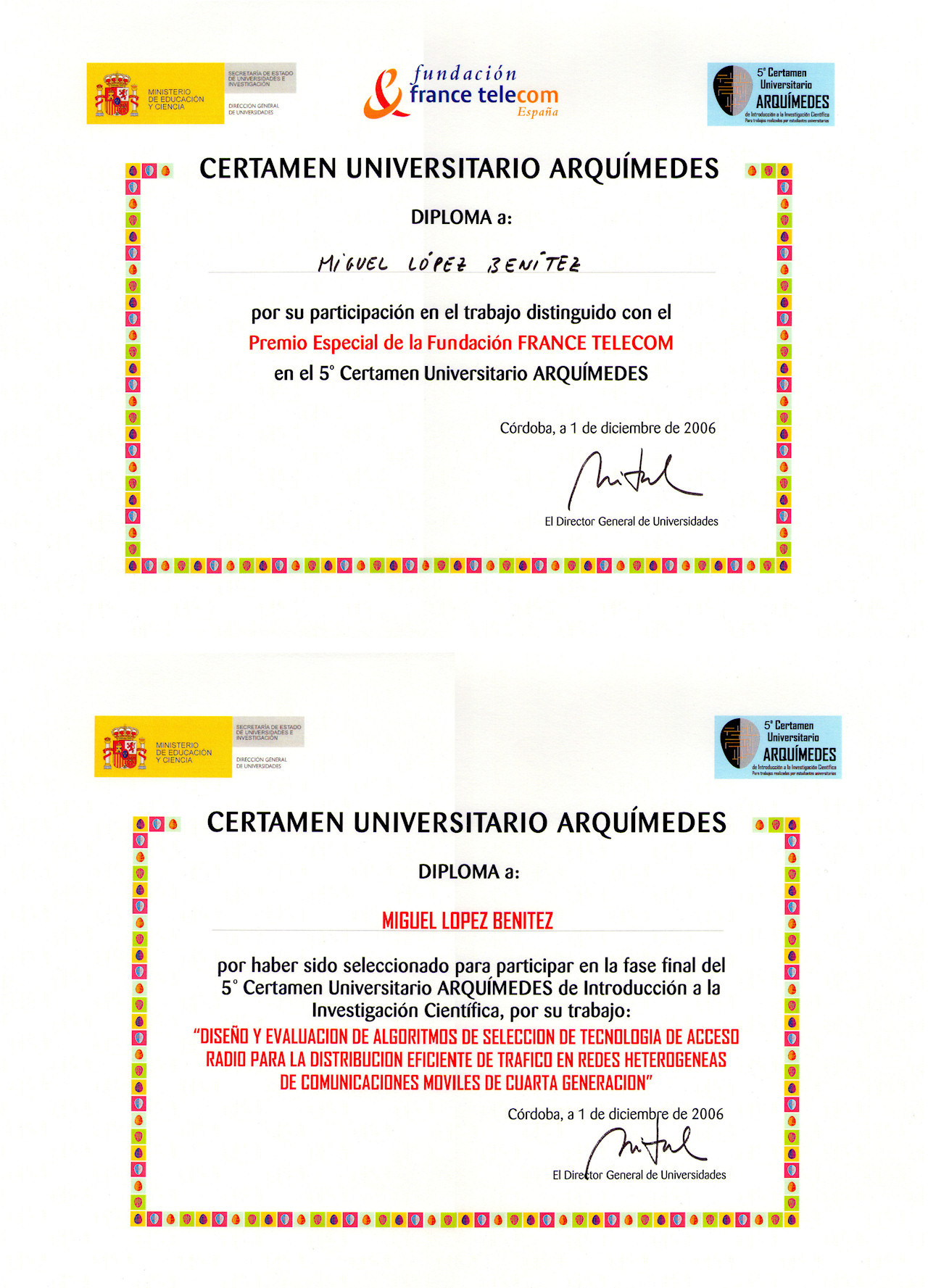 The 5th Archimedes University Competition is the main young scientist contest in Spain organised by the Spanish Ministry of Education and Science. This contest is aimed at promoting the realisation of original scientific and technological research projects among the Spanish university students. The contest distinguishes in a yearly basis those research works performed by university students that constitute a significant contribution to their corresponding fields of knowledge. In the contest, several sponsors award special prizes to the best works presented in their respective scientific and technological areas. This distinction was awarded by the France Telecom Foundation in recognition of my M.Sc. thesis, which was selected among more than 100 works presented to the contest.