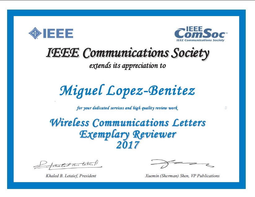 Exemplary reviewer of IEEE Wireless Communications Letters 2017.