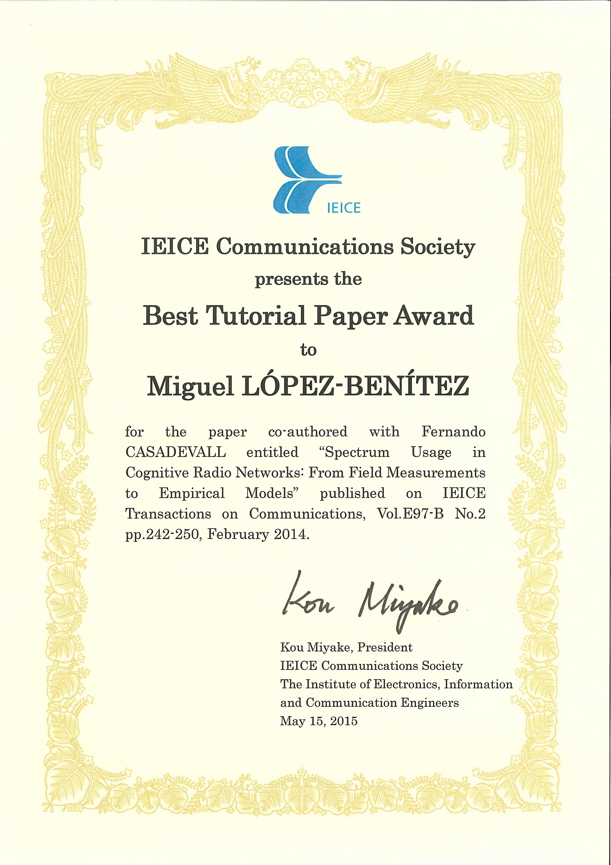 Awarded for the paper entitled "Spectrum usage in cognitive radio networks: From field measurements to empirical models," published in IEICE Transactions on Communications, Special Section on Technologies for Effective Utilization of Spectrum White Space, vol. E97-B, no. 2, pp. 242-250, Feb. 2014.