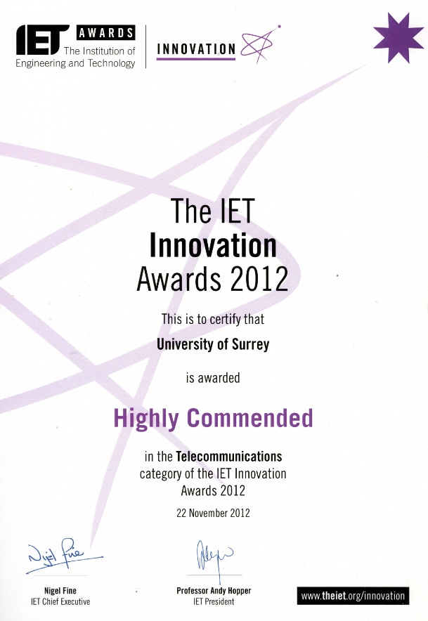 The IET Innovation Awards are open to individuals and organisations in both industry and academia. Judged by engineering experts, the IET Innovation Awards recognise the depth and breadth of innovative work carried out across all areas of engineering and technology. The work presented to these awards (Low-complexity high-performance spectrum sensing method for improved signal detection in low-cost wireless devices) was shortlisted, among more than 400 applications, as one of the five finalists for the awards in the category of Telecommunications.